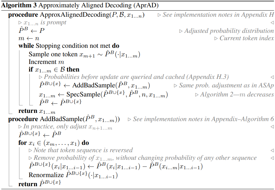 AprAD은 speculative decoding이 SSM에서 추출한 샘플을 LLM에서 추출한 샘플을 근사화하는 방식과 유사하게, 샘플 $x \sim \hat{P}^B$를 사용하여 샘플 \(x^\prime \sim \hat{P}^{B \cup \{x\}}\)를 근사한다. 즉, 확률 분포가 두 개의 별개 모델에서 생성되는 것이 아니라, 위반 샘플을 보정하기 전후에 동일한 모델에서 모두 생성된다. AprAD는 샘플링을 다시 시작하는 출발점으로 사용할 수 있는 $x$의 prefix를 speculative sampling으로 얻는다. $\hat{P}^B$와 \(\hat{P}^{B \cup \{x\}}\)의 분포가 매우 유사하기 때문에, 특히 언어 모델의 엔트로피가 상대적으로 높을 경우, 이 prefix는 일반적으로 $x$의 길이의 대부분을 차지한다.