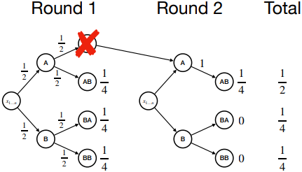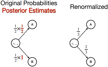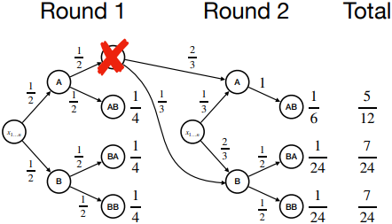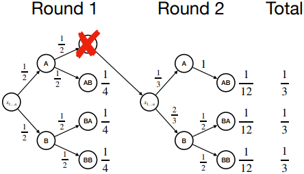 문제는 이 과정을 통해 확률이 낮은 샘플이 크게 증폭되는 경우가 있다는 것이다. Running example에서 AB가 샘플링될 확률은 1/2이기 때문에 이상적인 확률인 1/3보다 1.5배 증폭된다.