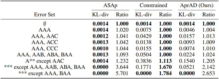 AprAD는 에러를 발견한 후에만 SpecSample을 호출하기 때문에 일부 시퀀스 확률을 여전히 증폭시킨다. Speculative decoding의 경우, AB가 SSM에 의해 직접 생성된 경우에도 SpecSample이 호출된다. 그러나 AprAD는 AB를 즉시 수용한다. 알고리즘이 모든 가능한 prefix 문자열을 순회할 수 없기 때문에, AA가 실제로 샘플링된 경우를 제외하고는 AA에 에러가 있는지 여부를 확인하지 않는다. 이로 인해 출력 확률 분포에서 AB가 약간 증폭되는 결과가 나타난다 (1/3 $\rightarrow$ 5/12).