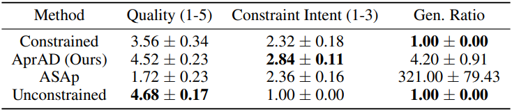 Constrained generation은 에러 발견 시 마지막 토큰만 교체하고 나머지 토큰은 재사용하며, ASAp는 모든 토큰을 버리고 처음부터 다시 생성한다. AprAD의 핵심 아이디어는 일부만 재사용하는 것이다. 얼마나 재사용할지를 speculative sampling을 통해 결정한다.