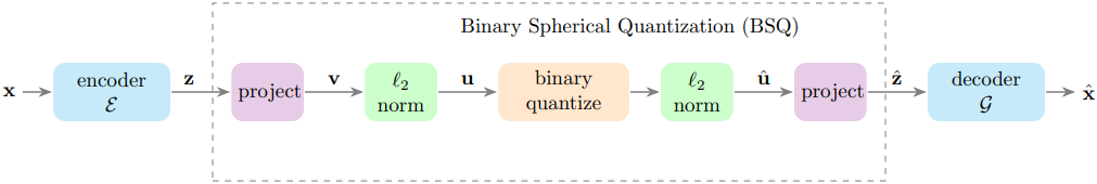 BSQ는 단위 구에 projection된 hypercube인 implicit codebook \(\textbf{C}_\textrm{BSQ} = \{ -\frac{1}{\sqrt{L}}, \frac{1}{\sqrt{L}} \}^L\)에 대해 최적화된다. Hypercube의 각 꼭짓점 \(\textbf{c}_k \in \textbf{C}_\textrm{BSQ}\)는 고유한 토큰 $k$에 해당한다.
