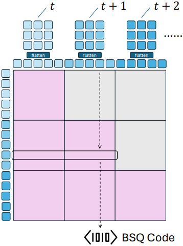 \[\begin{equation} \mathbb{E}_\textbf{u} [d(\textbf{u}, \hat{\textbf{u}})] < \sqrt{2 - \frac{2}{\sqrt{L}}} < \sqrt{2} \end{equation}\]2. Tokenization Network with Causal Video Transformer