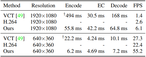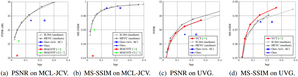 다음은 MCL-JCV 640$\times$360와 UVG 1920$\times$1080에서의 동영상 압축 결과이다.