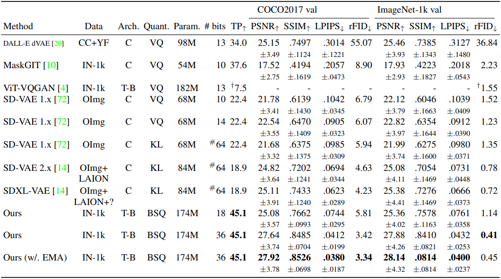 다음은 COCO2017과 ImageNet-1K 256$\times$256에서의 이미지 재구성 결과이다.