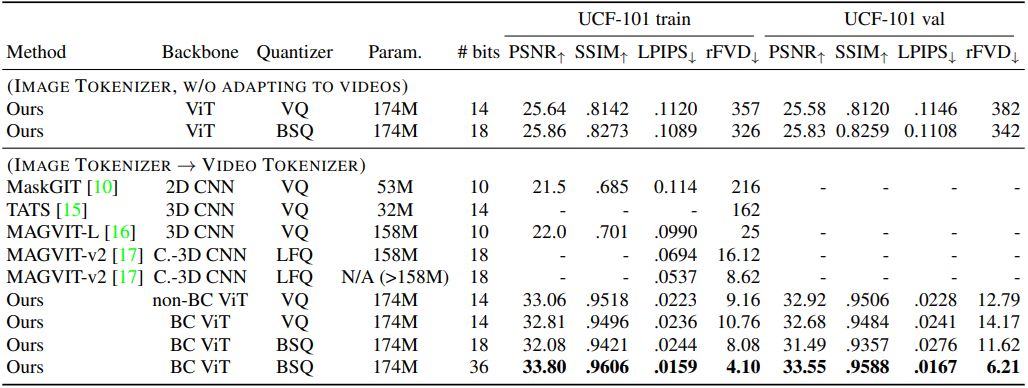 기존 동영상 데이터셋의 다양성 부족으로 인해, 먼저 이미지 데이터로 이미지 tokenizer를 학습시킨 후 이를 fine-tuning하여 동영상 tokenizer로 만든다. 사전 학습된 이미지 tokenizer를 동영상에 그대로 사용하는 것에 비해, fine-tuning을 거친 동영상 tokenizer가 동영상 벤치마크에서 훨씬 높은 복원 품질을 보여주었다. 유효 vocabulary 크기가 커질수록 이러한 성능 향상은 더욱 두드러진다. 제안된 BSQ를 통해 가능해진 이러한 vocabulary 크기 증가는 동영상 특유의 모션과 blur 현상을 학습하는 데 유용하다. 반면, 기존 VQ 방식은 codebook 크기가 16K를 초과하면 높은 codebook 사용률을 유지하지 못한다.