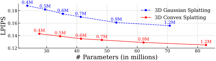 다음은 파라미터 개수에 따른 LPIPS를 3DGS와 비교한 결과이다. (장면: Truck)