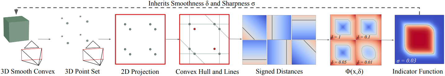 Smooth convex의 indicator function \(I(\textbf{p})\)는 SDF에 sigmoid 함수를 적용하여 정의된다.