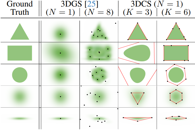 이러한 내재적 한계는 sphere packing 문제에서 나타나는데, 구형이나 타원형을 조밀하게 채우면 틈이 생겨 특히 평평하거나 날카로운 모서리 부분에서 비효율적인 커버리지가 발생한다. 구체나 타원체와 마찬가지로 틈 없이 공간을 채우려면 비현실적으로 많은 수의 Gaussian이 필요하게 되어 메모리 사용량과 계산 오버헤드가 증가하다.