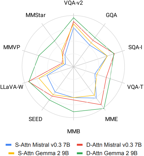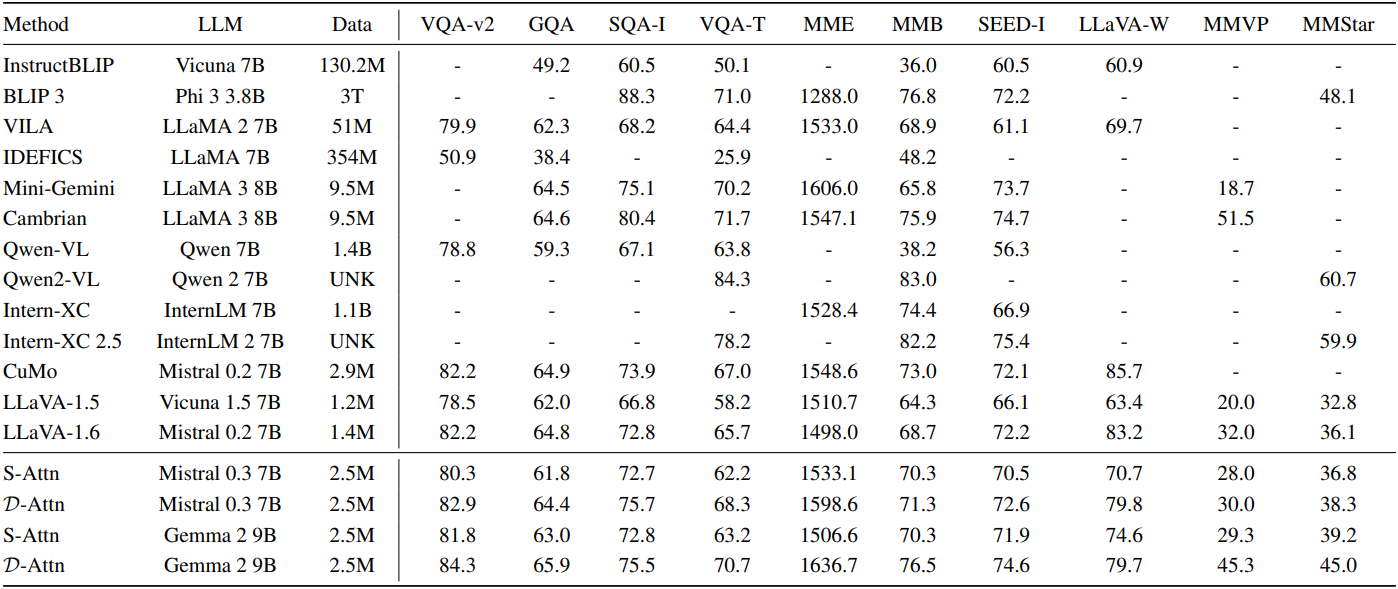본 논문에서는 S-Attn과 X-Attn 사이의 간극을 메우는 새로운 attention 아키텍처인 Decomposed Attention (D-Attn)을 제안하였다. 즉, S-Attn의 성능 이점을 유지하면서 X-Attn의 설계 유연성을 확보하였다. Causal self-attention을 V2V SA, T2V XA, T2T SA로 분해함으로써, D-Attn은 LLM에 비전 정보를 더 잘 통합하기 위한 설계의 유연성을 확보하는 동시에, 비주얼 토큰과 텍스트 토큰 간의 병합 전략을 통해 LLM의 사전 학습된 성능을 최대한 보존한다.