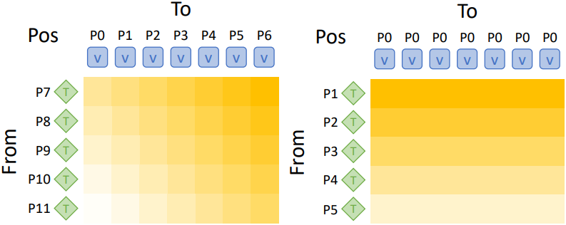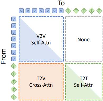 \[\begin{equation} \bar{t} = \textrm{Attn}(t, [V, T]) = \alpha_V \textrm{XA}(t, V) + \alpha_T \textrm{SA}(t, T) \end{equation}\]위에서 도출된 causal self-attention 분해를 통해, debiased positional encoding과 V2V diagonalization을 매끄럽게 통합할 수 있다. 구체적으로, T2V XA에 debiased positional encoding을 적용한 후, T2T SA와 결합한다. 또한, V2V SA에 V2V diagonalization을 적용할 수도 있다.