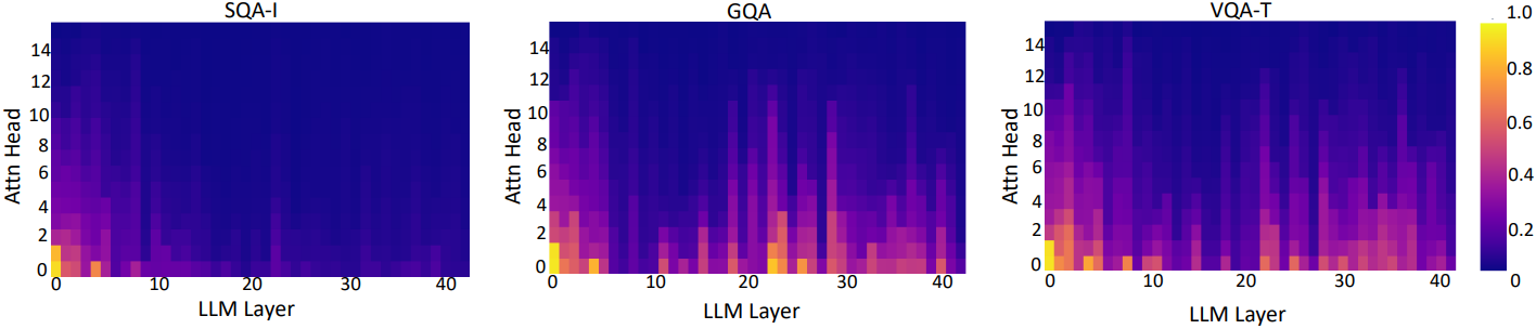 다음은 SQA-I, GQA, VQA-T 벤치마크에서 \(\alpha_V\) 값을 시각화한 결과이다.
