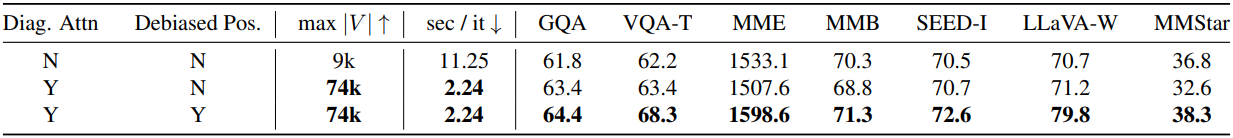 저자들은 비주얼 토큰과 텍스트 토큰 간의 바람직하지 않은 위치 편향을 제거하기 위한 debiased positional encoding을 제안하였다. 이를 통해 LLM이 비전 정보를 더 잘 활용하여 시각적 이해 능력을 크게 향상시킬 수 있다. 또한 성능 저하 없이 비주얼 토큰에 대해 계산 복잡도를 $O(\vert V \vert^2)$에서 $O(\vert V \vert)$로 크게 줄이는 V2V diagonalization을 제안하였다.