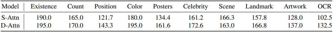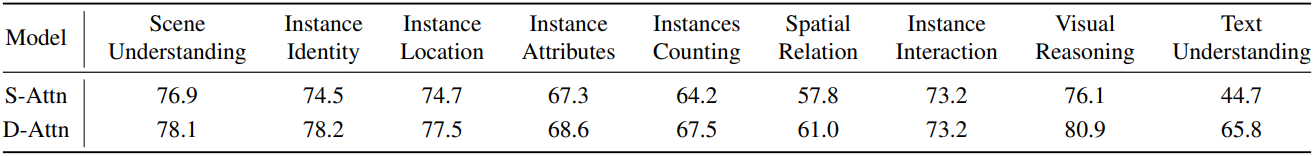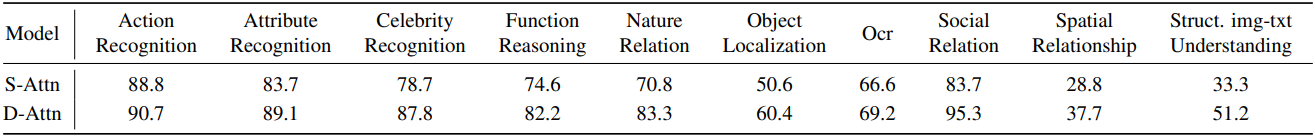 다음은 위에서부터 MME, SEED, MMB 벤치마크에 대한 S-Attn과의 디테일한 비교 결과들이다.