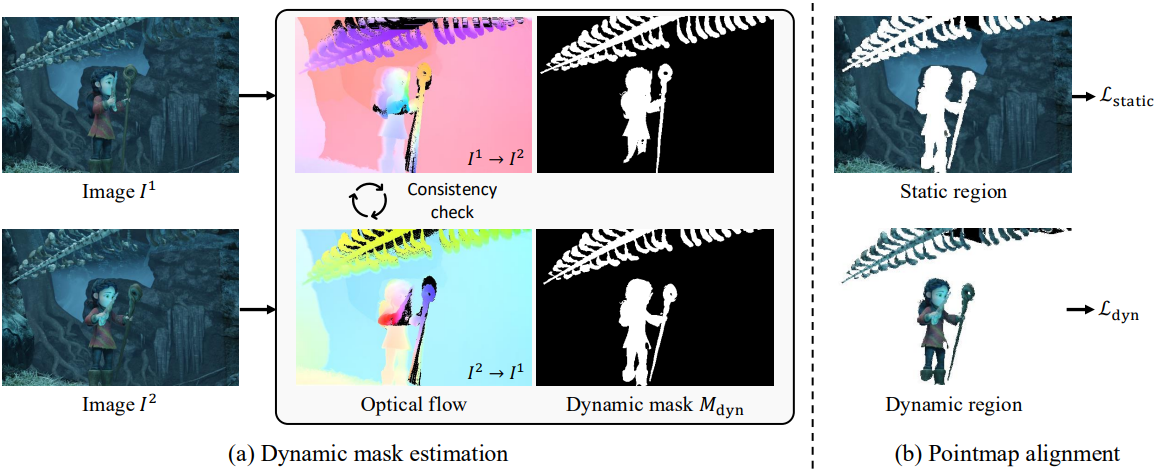 동적 영역은 카메라 모션과 object에서는 고유의 움직임 간의 불일치로 인해 pointmap을 정확하게 정렬하는 데 상당한 어려움을 야기한다. 이러한 동적 모션을 명시적으로 고려하지 않으면 네트워크는 동적 영역을 정적 영역처럼 잘못 맞추려고 시도하여 재구성 정확도를 저하시킬 수 있다.