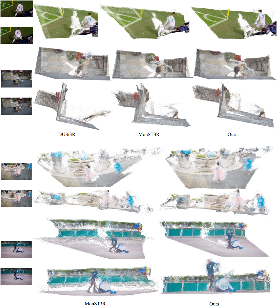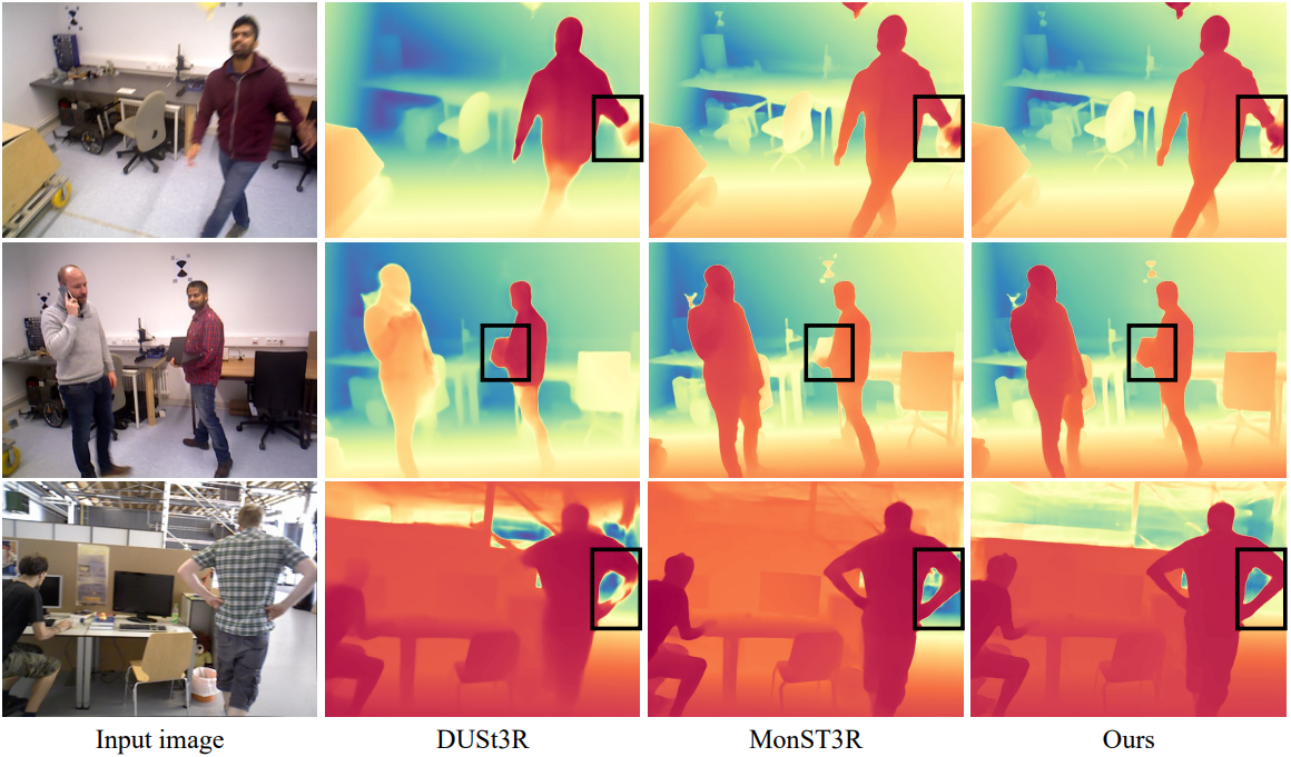 DUSt3R는 장면의 geometry, 픽셀과 장면 간의 대응 관계, 그리고 뷰 간의 관계를 인코딩하는 3D pointmap을 직접 예측하여, 다단계 파이프라인에서 흔히 발생하는 오차 누적을 줄였다. DUSt3R는 정적 시나리오에서는 강점을 보이지만, rigidity 가정으로 인해 동적 장면에서는 상당한 어려움을 겪는다.