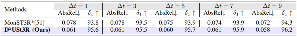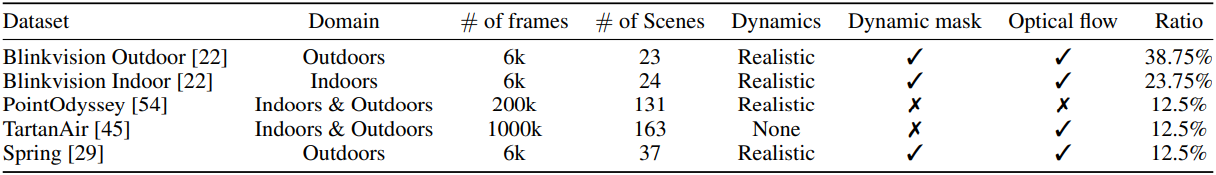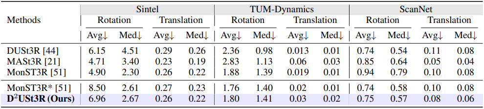 \[\begin{equation} \mathcal{L}_\textrm{total} = \mathcal{L}_\textrm{static} + \mathcal{L}_\textrm{dyn} \end{equation}\]이 loss function을 통해 모델은 동적 장면에서 정확한 3D geometry와 robust한 correspondence를 포착하는 동시에 정적 영역에서 DUSt3R의 장점을 유지할 수 있다.