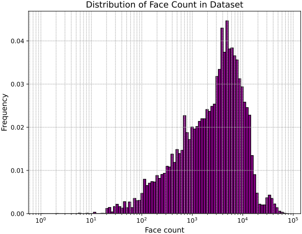 학습 데이터의 품질은 모델 성능을 근본적으로 좌우한다. 그러나 기존 3D 데이터셋은 품질 변동성이 매우 크며, 많은 샘플이 불규칙한 topology, 과도한 파편화, 또는 극심한 기하학적 복잡성을 포함하고 있다. 이 문제를 완화하기 위해, 저자들은 기하학적 구조와 시각적 충실도를 기반으로 품질이 낮은 메쉬를 필터링하는 데이터 큐레이션 전략을 제안하였다. 위 그림에서 볼 수 있듯이, 큐레이션된 데이터셋의 면 개수 분포는 고품질 메쉬 컬렉션임을 보여준다.