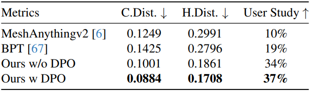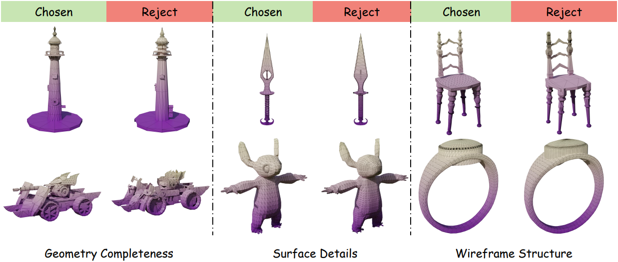 사전 학습된 모델은 고품질 메쉬를 생성할 수 있지만, 미관상 좋지 않거나 geometry가 불완전한 경우가 종종 발생한다. 결과를 더욱 향상시키기 위해 Direct Preference Optimization (DPO)를 사용하여 출력을 사람의 선호도에 맞춰 조정하였다. 또한, 선호도 데이터셋을 큐레이션하기 위한 포괄적인 주석 파이프라인을 개발하여 결과의 전반적인 품질을 향상시켰다.