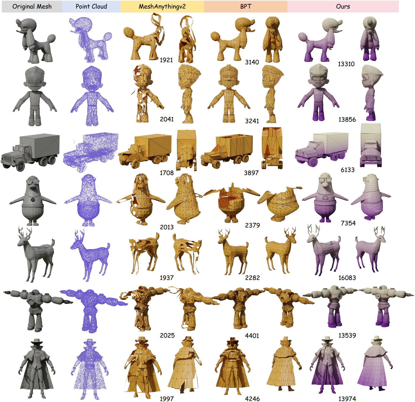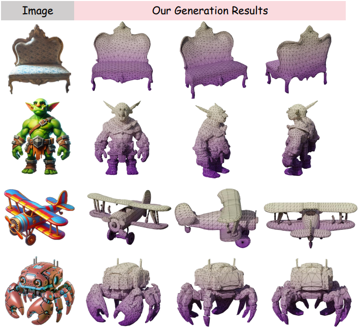 - 기존 방법은 출력을 인간의 선호도에 맞춰 조정하는 메커니즘이 부족하여 예술적으로 정교한 메쉬를 생성하는 데 한계가 있다. 또한, 생성된 메쉬는 구멍, 누락된 부분, 중복된 구조와 같은 기하학적 결함을 보이는 경우가 많다.