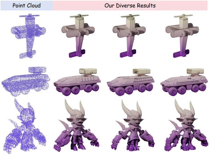 다음은 동일한 포인트 클라우드에 대한 다양한 생성 예시들이다.