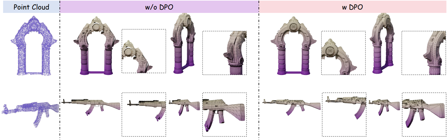 \[\begin{equation} \mathcal{L}_\textrm{DPO} (\pi_\theta; \pi_\textrm{ref}) = -\mathbb{E}_{(c, y^{+}, y^{-}) \sim \mathcal{D}} \left[ \log \sigma \left( \beta \log \frac{\pi_\theta (y^{+} \vert c)}{\pi_\textrm{ref} (y^{+} \vert c)} - \beta \log \frac{\pi_\theta (y^{-} \vert c)}{\pi_\textrm{ref} (y^{-} \vert c)} \right) \right] \end{equation}\]저자들은 구축된 선호도 쌍 데이터셋을 사용하여 모델을 fine-tuning시키고, 위의 loss function을 적용하여 기하학적 충실도와 미적 매력 모두에 맞춰 출력을 정렬하였다. 또한, 학습 효율성을 유지하기 위해 사전 학습 단계에서 사용한 것과 동일한 truncated training 전략을 채택하여 데이터셋의 고해상도 메쉬에서 생성된 긴 토큰 시퀀스를 처리한다.