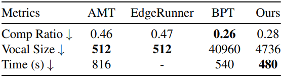 이러한 설계를 통해 향상된 알고리즘은 약 72%의 압축률을 달성하여 시퀀스 길이를 크게 줄이고 고해상도 데이터셋에 대한 학습을 더욱 용이하게 한다. 또한, 모델이 학습해야 하는 vocabulary 크기도 훨씬 작아져 학습 효율이 크게 향상되었다.