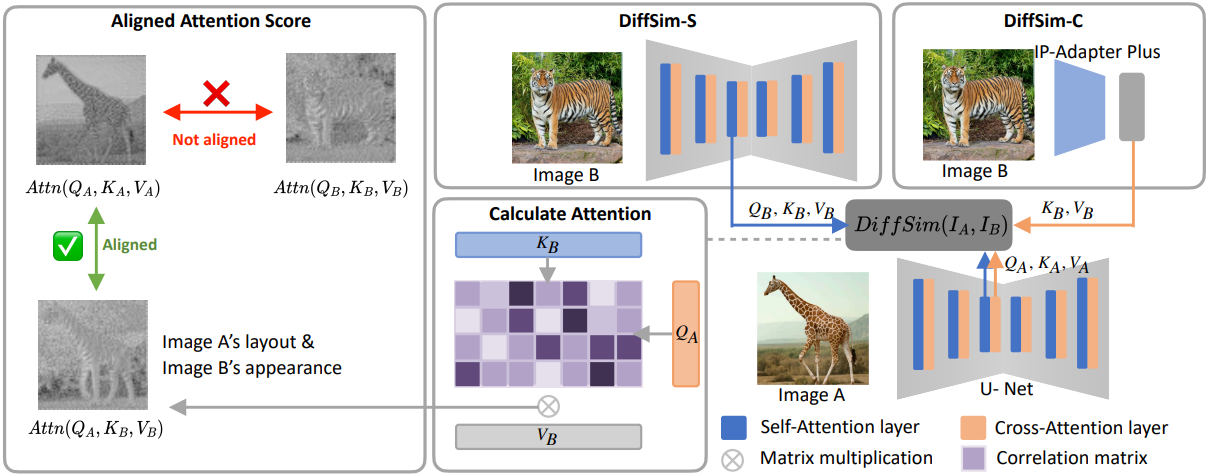 이러한 문제를 해결하기 위해, 본 논문에서는 U-Net의 self-attention layer에서 이미지 A와 B의 feature를 정렬하기 위해 attention 메커니즘을 혁신적으로 활용하고, 정렬된 feature 간의 코사인 거리를 계산하는 Aligned Attention Score (AAS)를 제안하였다.