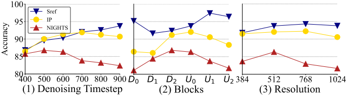 또한, 본 논문에서는 denoising U-Net 내에서 다양한 layer와 denoising timestep에 따른 feature 변화를 살펴보았다. 그 결과, 얕은 layer와 높은 timestep은 저수준 및 스타일 유사성 평가에 적합하고, 깊은 layer와 낮은 timestep은 semantic 유사성 평가에 탁월하다는 것을 발견했다. 이는 DiffSim이 간단한 설정 조정을 통해 다양한 유사도 측정 방식을 구현할 수 있음을 시사한다.