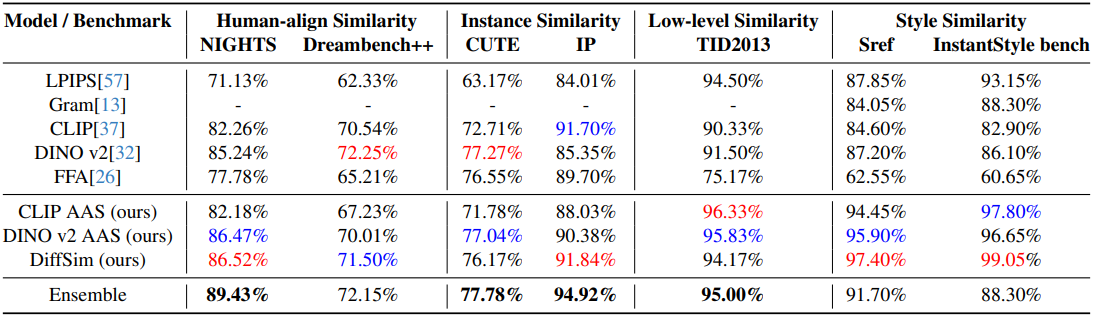 \[\begin{aligned} \textrm{AAS}(L_A, L_B) &= \textrm{cos}(\textrm{attn}(Q_A, K_A, V_A), \textrm{attn}(Q_A, K_B, V_B)) \\ \textrm{AAS}(L_B, L_A) &= \textrm{cos}(\textrm{attn}(Q_B, K_B, V_B), \textrm{attn}(Q_B, K_A, V_A)) \end{aligned}\]AAS는 attention layer에서 dense한 latent 표현을 정렬함으로써 각 이미지의 feature가 다른 이미지의 feature에 대해 query와 key로 모두 평가되도록 한다. 이 방법은 픽셀 정렬 부족을 보완할 뿐만 아니라 feature space의 풍부함을 보존하여 인간의 시각적 판단과 더욱 밀접하게 일치하는 지각적 유사성 측정 방법을 제공한다.