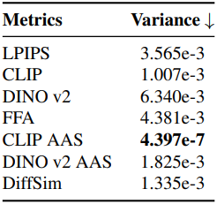 본 논문은 semantic 컨텐츠 및 스타일과 같은 다양한 측면을 측정하면서 이미지 간의 암시적인 정렬을 제공하도록 설계된 새로운 metric인 Aligned Attention Score (AAS)를 도입하였다. MSE나 코사인 유사도와 같은 기존 유사도 평가 방법은 이미지의 latent feature가 픽셀 단위로 정렬되어 있다고 가정하는 경우가 많다. 그러나 이러한 가정은 실제 응용 분야에서 자주 실패하여 부정확한 유사도 측정으로 이어진다. 또한 CLIP 및 DINO와 같은 널리 사용되는 방법은 MLP를 사용하여 고차원 feature를 저차원 feature로 압축하고 이러한 단순화된 표현에 대해 코사인 유사도를 계산한다. Semantic 수준의 비교에는 효과적이지만, 이러한 압축 과정은 중요한 디테일을 손실하여 미묘한 차이를 포착하지 못할 수 있다.