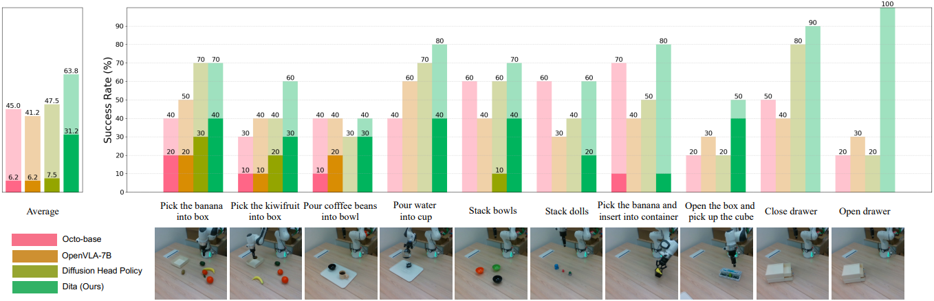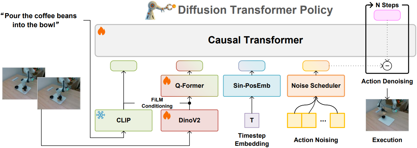 본 논문에서는 scalability를 확보하기 위해 Diffusion Transformer (DiT) Policy인 Dita를 소개한다. 이 아키텍처는 in-context conditioning 메커니즘과 causal transformer를 통합하여 action 시퀀스의 noise를 제거함으로써 이미지 토큰에 대한 action denoising의 직접적인 컨디셔닝을 가능하게 하고, 과거 observation 데이터에서 미묘한 차이를 식별할 수 있도록 한다.