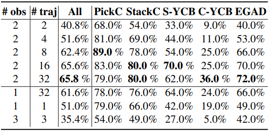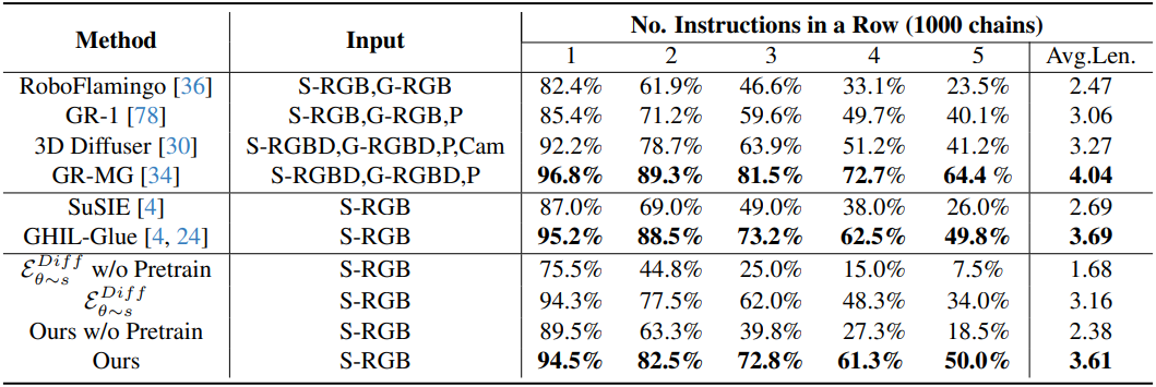 다음은 Calvin에서의 성공률과 평균 성공 길이를 비교한 결과이다. (‘S-‘는 static, ‘G-‘는 gripper를 뜻함)