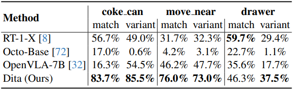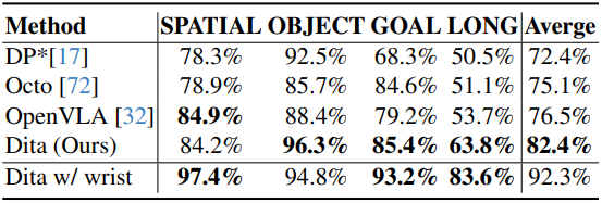 본 논문에서는 scalability를 확보하기 위해 Diffusion Transformer (DiT) Policy인 Dita를 소개한다. 이 아키텍처는 in-context conditioning 메커니즘과 causal transformer를 통합하여 action 시퀀스의 noise를 제거함으로써 이미지 토큰에 대한 action denoising의 직접적인 컨디셔닝을 가능하게 하고, 과거 observation 데이터에서 미묘한 차이를 식별할 수 있도록 한다.