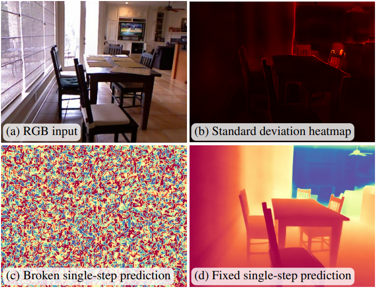 저자들은 Marigold의 inference 시의 동작을 분석해 보았다. 위 그림의 (b)는 Marigold의 기본 50-step inference 시에 step에 대한 표준 편차를 보여준다. 거의 모든 픽셀에서 매우 작은 차이가 관찰되었는데, 이는 inference 중 모델이 예측을 거의 변경하지 않음을 나타낸다. 이는 50-step의 첫 번째 예측이 이미 최종 출력과 거의 일치함을 의미한다. Single-step 출력은 50-step의 첫 번째 step과 유사할 것으로 예상되지만, 위 그림의 (c)에서 볼 수 있듯이 첫 번째 step의 출력은 순수한 noise에 해당한다.