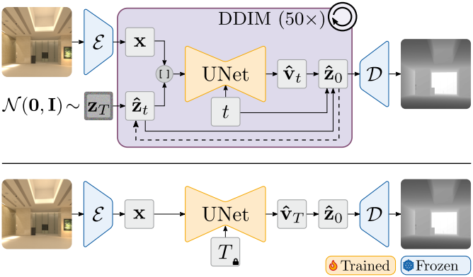 \[\begin{equation} \hat{\textbf{z}}_0 = \sqrt{\vphantom{1} \bar{\alpha}_t} \textbf{z}_t - \sqrt{1 - \bar{\alpha}_t} \hat{\textbf{v}}_\theta ([\textbf{z}_t, \textbf{x}], t) \end{equation}\]를 사용하여 latent depth map 예측으로 변환할 수 있으며, 이는 고정된 VAE 디코더를 사용하여 디코딩되고 GT depth map과 비교된다. Marigold는 MSE loss를 사용하여 GT depth map의 latent를 일치시키도록 학습하는 반면, 저자들은 디코딩된 depth map의 예측을 최적화하였다. 결과적으로 생성된 feed-forward model은 deterministic하며, task별 loss를 사용하여 end-to-end로 학습된다.