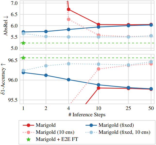 Inference 파이프라인을 약간 수정하면 Marigold와 비슷한 모델은 multi-step 앙상블 inference와 비슷한 single-step 성능을 얻을 수 있으며, 200배 이상 빠르다. 실제로 이 버그 수정을 통해 diffusion 기반 깊이 추정 속도가 SOTA 모델과 비슷해져 다음과 같은 추가 개선을 위한 흥미로운 길이 열렸다.