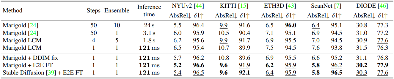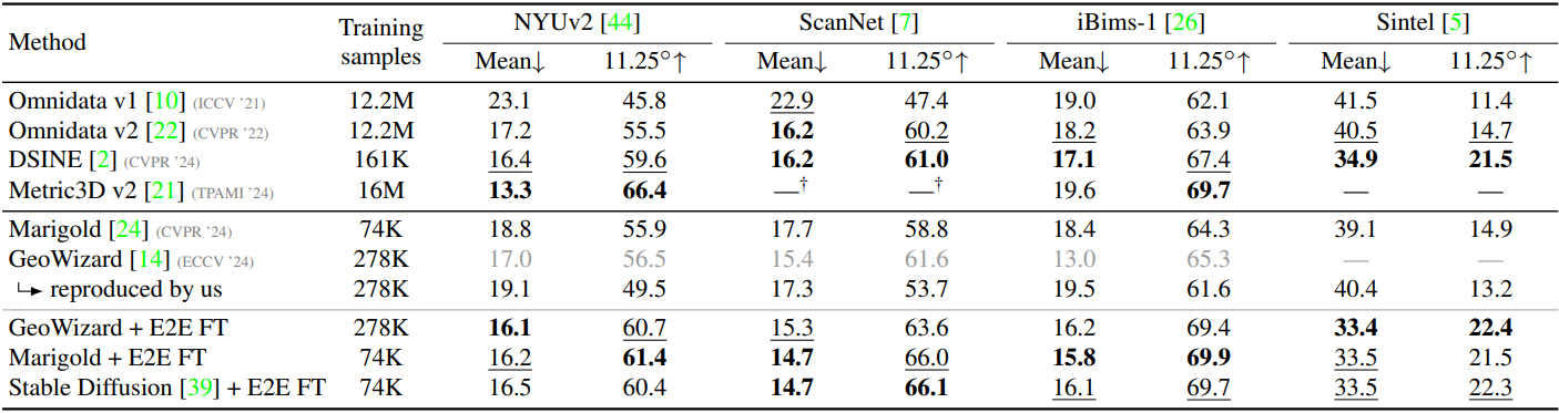- base model: 깊이 추정의 경우 Marigold의 checkpoint를 사용, normal 추정은 Marigold와 동일한 방법으로 학습