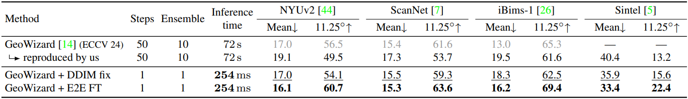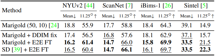 저자들은 scale- and shift- invariant loss를 사용하여 monocular 이미지에 대한 deterministic affine-invariant depth estimator로 Marigold를 end-to-end fine-tuning했다. 놀랍게도 이 모델은 Marigold의 최적 구성보다 성능이 우수했다. 표면 normal 추정의 경우에도 유사한 결과를 얻었다. Task별 loss를 적용한 end-to-end fine-tuning은 더 많은 데이터로 학습된 더 복잡한 아키텍처보다 성능이 우수했다.