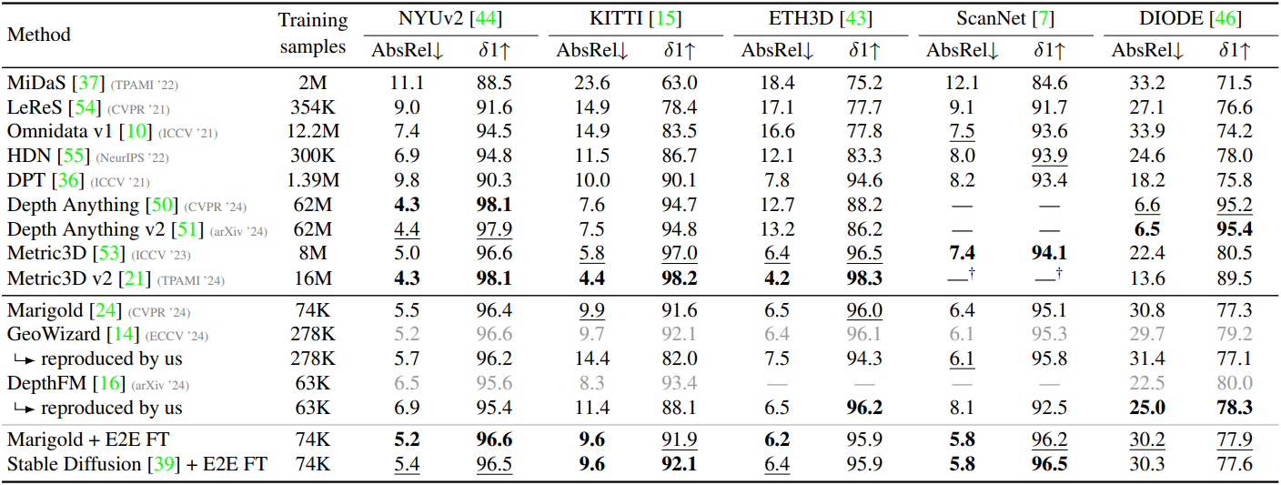 - 데이터셋: Hypersim, Virtual KITTI 2 (Marigold와 동일)