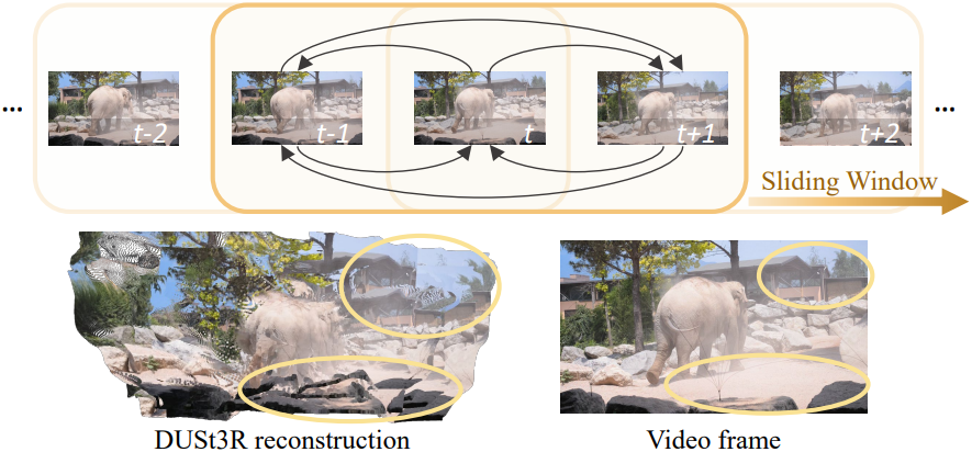 멀티뷰 이미지가 주어지면, DUSt3R는 이미지를 쌍으로 처리하고, 모든 시점에 걸쳐 connectivity graph를 사용하여 쌍별 예측을 공동 좌표 공간에 글로벌하게 정렬한다. 그러나 이 접근법은 시점의 connectivity가 이미 알려져 있기 때문에 동영상 시퀀스에 대한 계산 중복성을 야기한다.