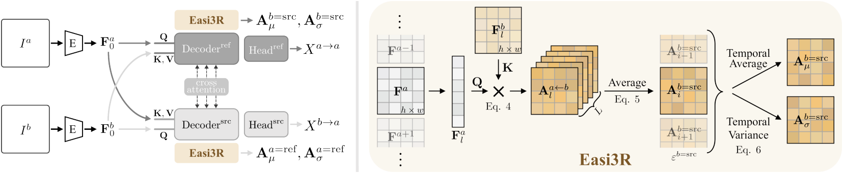 저자들은 DUSt3R가 유사한 메커니즘을 암시적으로 학습했음을 관찰하였다. 이를 바탕으로 동적 동영상에서 동적 물체 segmentation, dense한 pointmap 재구성, robust한 카메라 포즈 추정을 달성하는 학습이 필요 없는 방법인 Easi3R를 소개한다. DUSt3R는 attention layer를 사용하여 두 개의 이미지 feature를 입력으로 받고 픽셀 정렬된 pointmap을 출력으로 생성한다. 이러한 attention layer는 레퍼런스 시점 좌표 공간에서 pointmap을 직접 예측하도록 학습되어 입력 시점 간의 이미지 feature를 암시적으로 매칭하고 feature space에서 시점 변환을 추정한다.