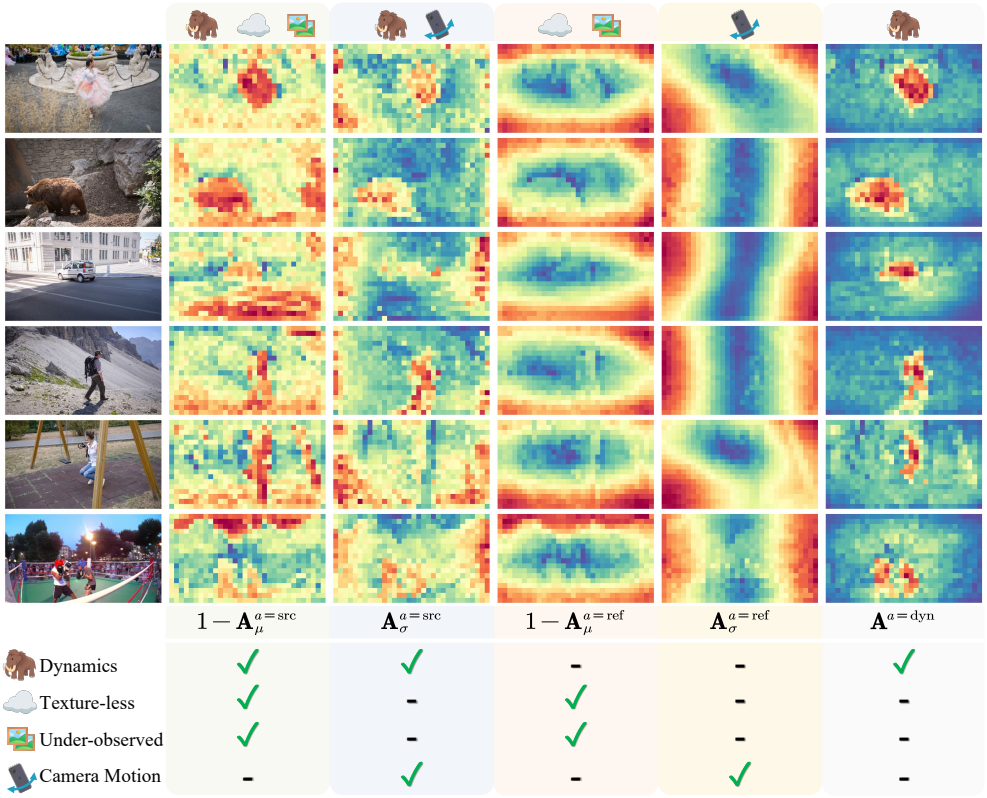 저자들의 통찰력은 DUSt3R가 cross-attention layer를 통해 뷰 변환을 암시적으로 학습하여, 텍스처가 없는 영역, 관찰되지 않은 영역, 동적 영역과 같이 epipolar 제약 조건을 위반하는 토큰에 낮은 attention 값을 할당한다는 것이다. 저자들은 공간적 차원과 시간적 차원에 걸쳐 cross-attention 출력을 집계함으로써, attention layer에서의 동작을 추출하였다.