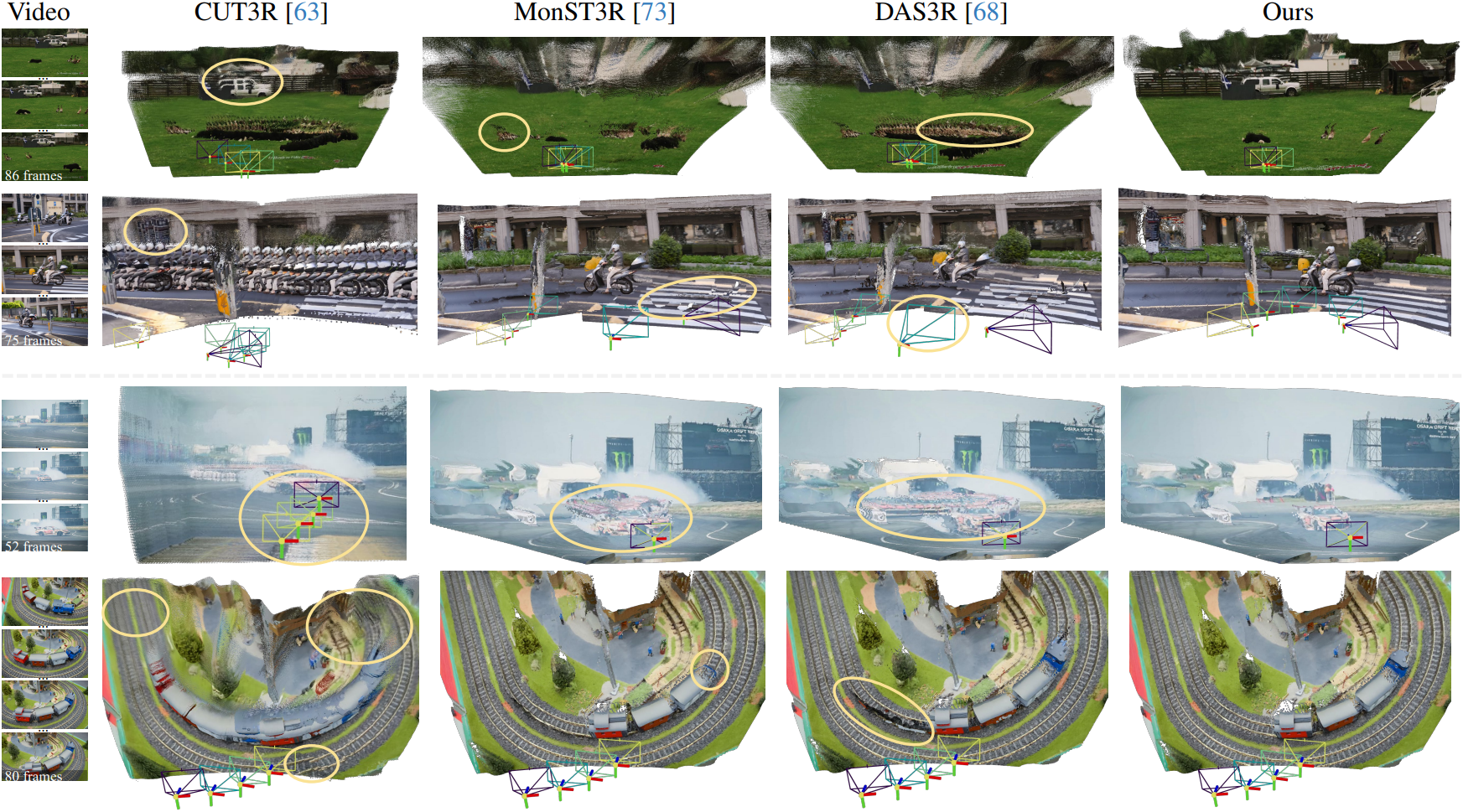 정적 SfM과 동적 SfM 간의 정확도와 robustness 격차의 주요 원인은 실제 동영상에서 일반적인 물체의 움직임이다. 움직이는 물체는 기존 SfM 방법의 homography 및 epipolar 일관성의 기본 가정을 위반한다. 또한 카메라 모션과 물체 모션이 종종 얽히는 동적 동영상에서 이러한 방법은 두 모션을 분리하는 데 어려움을 겪으며, 종종 풍부한 텍스처를 가진 모션이 주로 카메라 포즈 추정에 잘못 기여하게 한다. MonST3R나 CUT3R와 같은 최근 방법들은 이러한 과제를 해결하기 위해 진전을 이루었지만, 이러한 성공은 광범위한 학습 데이터 또는 깊이, optical flow, object mask를 추정하는 task별 prior 모델에 기반한다.