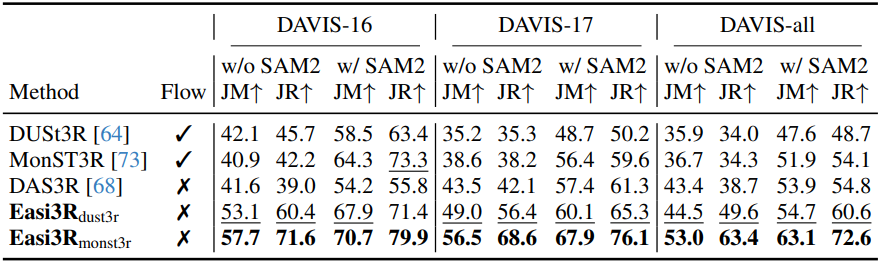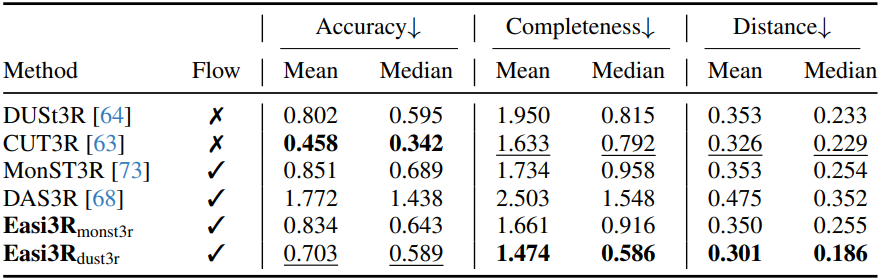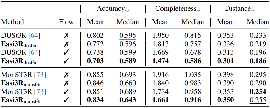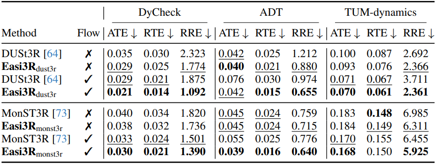 \[\begin{equation} \mathcal{L}_\textrm{flow} = \sum_{t \in T} \sum_{i \in \epsilon^t} (1 - \textbf{M}^a) \cdot \| \hat{\mathcal{F}}_i^{a \rightarrow b} - \mathcal{F}_i^{a \rightarrow b} \|_1 + (1 - \mathbb{M}^b) \cdot \| \hat{\mathcal{F}}_i^{b \rightarrow a} - \mathcal{F}_i^{b \rightarrow a} \|_1 \end{equation}\]최적화 과정에 flow 제약 조건을 포함함으로써 글로벌 pointmap \(\mathcal{X}^\ast\)와 포즈 시퀀스 \(\textbf{P}^t\), \(\textbf{K}^t\)에 대해 더욱 robust한 출력을 얻을 수 있다.