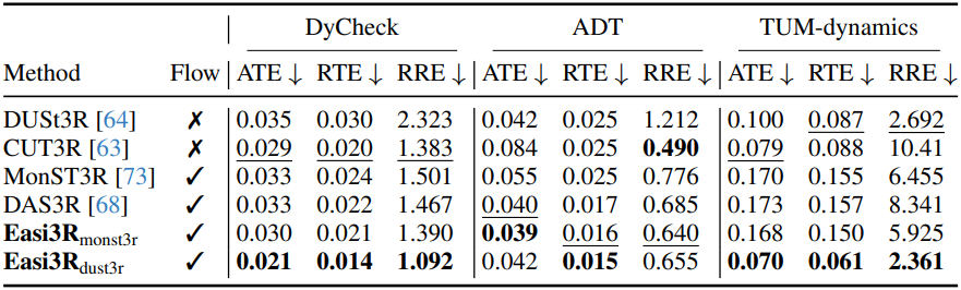 Easi3R는 광범위한 데이터셋에서 놀라운 성능을 보이며, 동적 데이터셋에서 학습된 CUT3R, MonST3R, DAS3R보다 훨씬 뛰어나다.