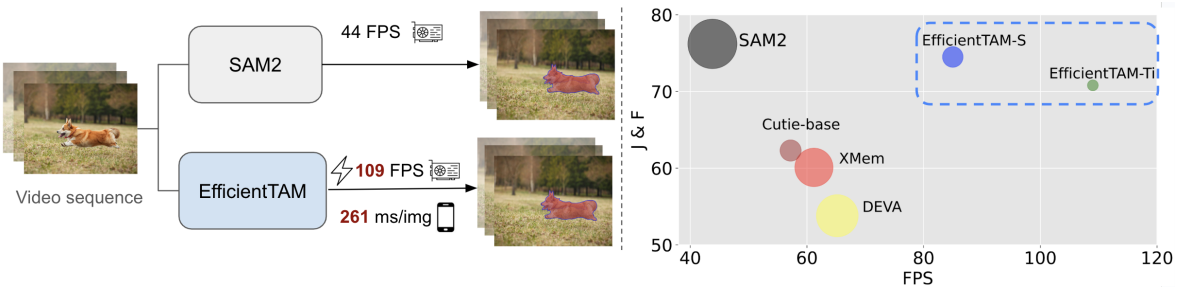 SAM 2는 모바일 배포에 효율적이지 않다. SAM 2의 기본 이미지 인코더인 HieraB+는 파라미터 비효율적이다 (80M). Tiny 버전이 있지만, 계층적인 이미지 인코더로 인해 실행 시간이 43.8 FPS로 기본 SAM 2 모델의 47.2 FPS와 유사하다. 또한, 메모리 토큰이 길어 (약 3만) cross-attention이 적용된 메모리 모듈의 효율성을 저해한다.