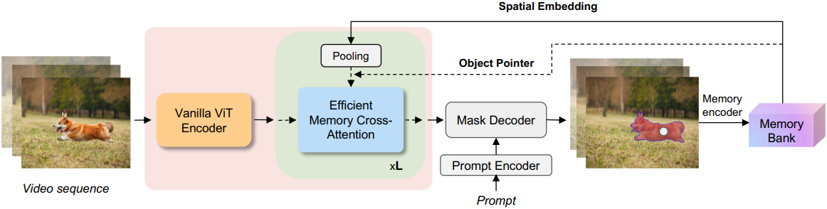 SAM 2의 아키텍처는 계층적 이미지 인코더, 프롬프트 기반 마스크 디코더, 그리고 새로운 메모리 메커니즘으로 구성된다. 안정적인 object tracking을 위해 SAM 2는 메모리 인코더, memory bank, memory attention 모듈로 구성된 메모리 메커니즘을 사용한다. SAM 2는 과거 프레임의 정보를 저장하고, memory attention 모듈을 사용하여 memory bank에 저장된 메모리와 현재 프레임 feature 간의 cross-attention을 수행하여 동영상의 시간적 의존성을 파악한다.