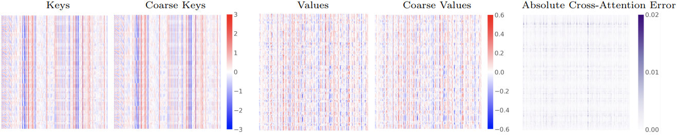 \[\begin{equation} \bar{K} = [\bar{K}_s; K_p] \in \mathbb{R}^{(n+P) \times d}, \quad \bar{V} = [\bar{V}_s; V_p] \in \mathbb{R}^{(n+P) \times d} \end{equation}\]Coarse한 메모리 토큰 $\bar{K}$와 $\bar{V}$에 대해 다음과 같이 효율적으로 cross-attention을 계산한다.