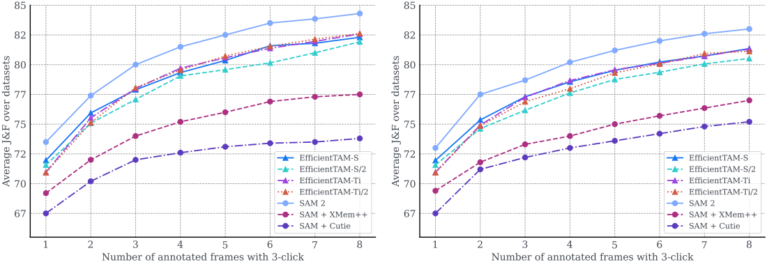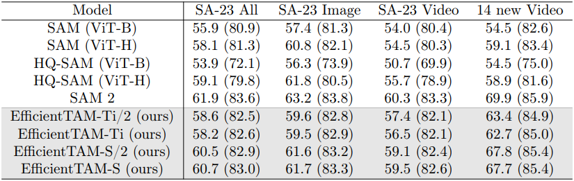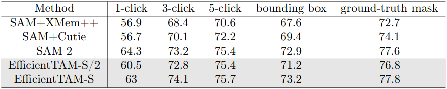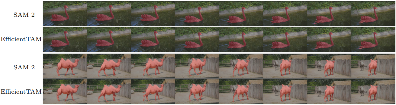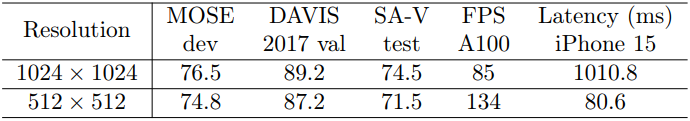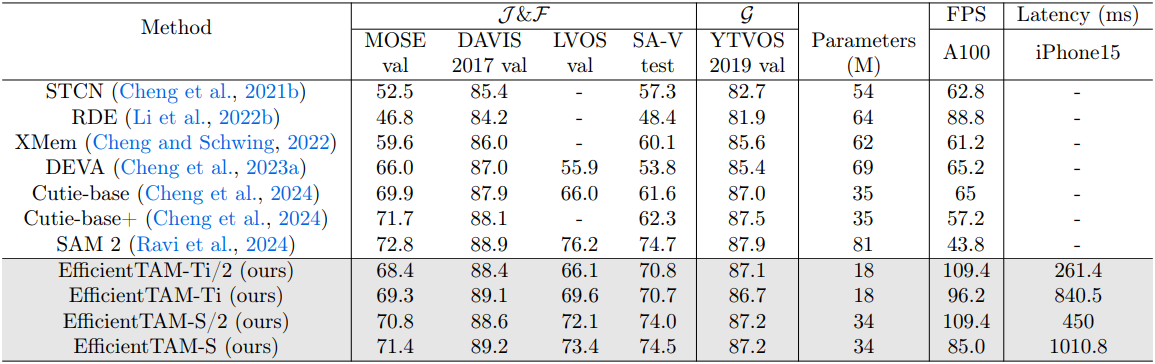 EfficientTAM은 강력한 semi-supervised VOS 방법보다 성능이 뛰어나면서도 효율성이 더 높다. SAM 2와 비교했을 때, EfficientTAM은 SA-V 테스트 데이터셋에서 비슷한 성능을 보이며, FPS는 약 2배 감소했다. Image segmentation 벤치마크인 SA-23에서 EfficientTAM은 60.7%의 정확도를 달성했으며, SAM은 59.1%, SAM 2는 61.9%의 정확도를 보였다. 또한, iPhone 15 Pro Max에서 약 10 FPS의 속도로 합리적인 video segmentation 성능을 구현하였다.