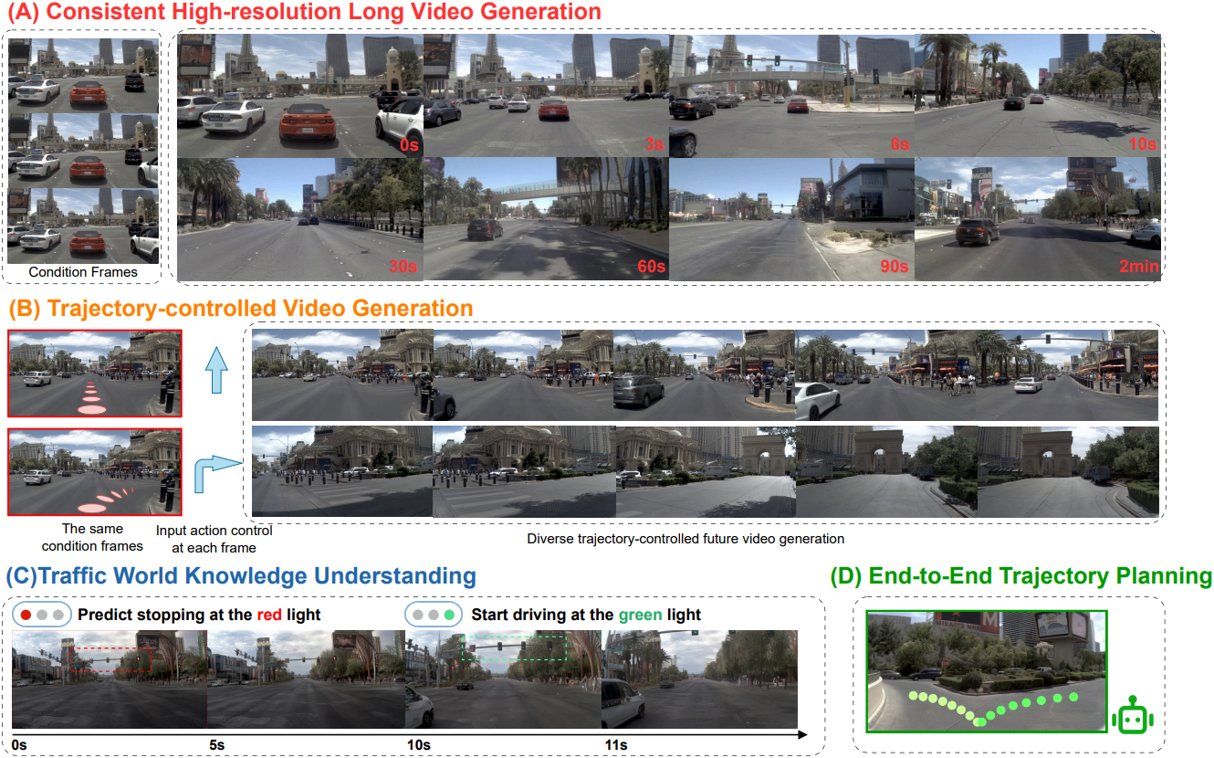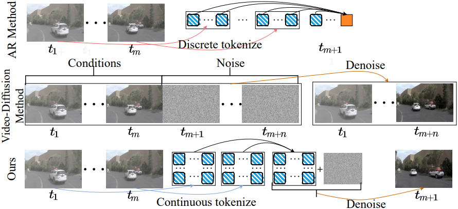 \[\begin{equation} \pi (\{\textbf{a}_{T \rightarrow T+i}\}_{i=1}^n \; \vert \; \{\textbf{O}_t, \textbf{a}_{t-1 \rightarrow t}\}_{t=1}^T) \\ p (\textbf{O}_{T+1} \; \vert \; \{\textbf{O}_t, \textbf{a}_{t-1 \rightarrow t}\}_{t=1}^T, \textbf{a}_{T \rightarrow T+1}) \end{equation}\]다음 프레임 예측은 모델이 예측한 action 또는 외부에서 제공된 action \(\textbf{a}_{T \rightarrow T+1}\)에 따라 결정된다. 인과적인 시간 모델링과 세밀한 미래 예측을 분리함으로써, 본 모델은 continuous한 표현으로 autoregressive 방식으로 유연한 길이의 긴 동영상을 생성할 수 있다. 또한, 궤적 planning과 시각적 생성을 분리함으로써, 본 모델은 실시간 motion planner로서 원활하게 기능하여 현재의 주행 환경 모델과 end-to-end motion planner 사이의 격차를 해소할 수 있다.